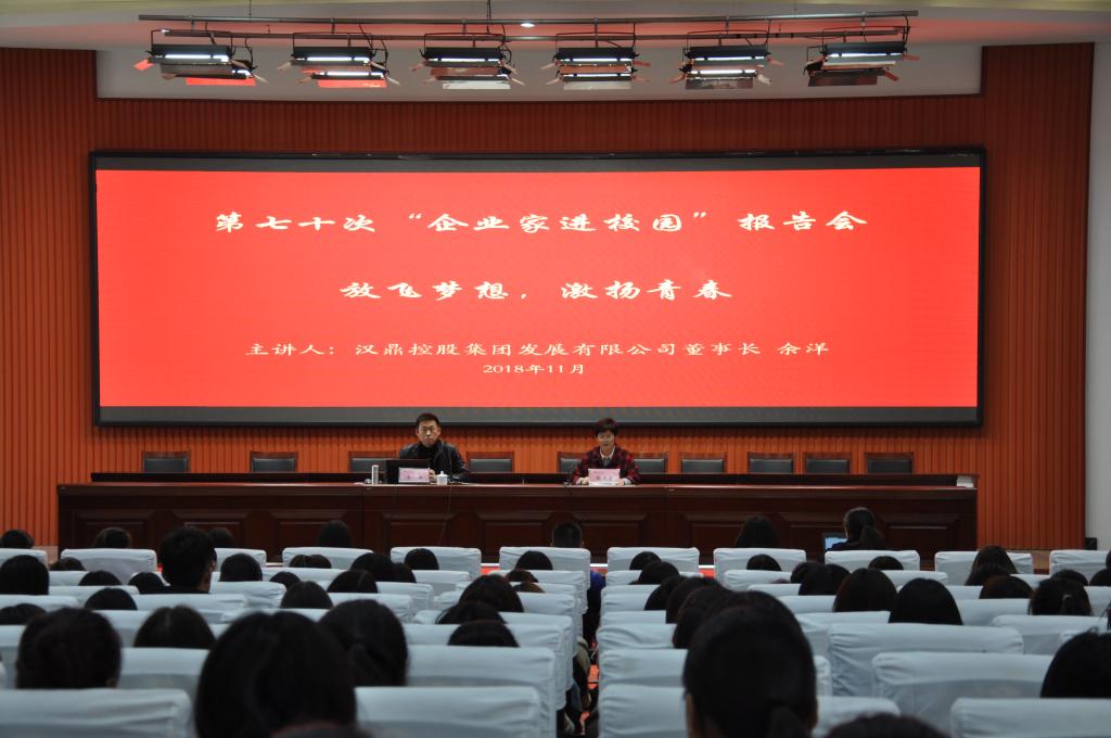 11月29日下午,学院第七十次“企业家进校园”活动在滨海校区清泽楼报告厅举行,汉鼎控股集团发展有限公司董事长余洋,作了主题为“梦想起航,青春激扬”的讲座。经营管理学院师生300余人参加了报告会。